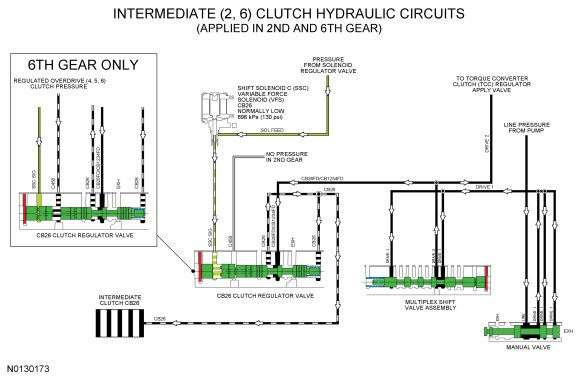 When the intermediate (2, 6) clutch is applied in 2nd and 6th gears, LINE pressure from the pump is directed to the multiplex shift valve by the manual valve through the DRIVE 1 hydraulic circuit. The multiplex shift valve supplies the intermediate (2, 6) clutch regulator valve with pressure through the DRIVE 2 and CB26FD/CB1234FD hydraulic circuits. The intermediate (2, 6) clutch regulator valve is controlled by SSC (Shift Solenoid C) and directs regulated pressure to the intermediate (2, 6) clutch through the CB26 hydraulic circuit. The CB26 hydraulic circuit also supplies pressure to the opposite side of the CB26 clutch regulator valve for gradual intermediate (2, 6) clutch engagement. Regulated overdrive (4, 5, 6) clutch pressure is supplied to the intermediate (2, 6) clutch regulator valve in 6th gear to boost the SSC (Shift Solenoid C) solenoid pressure.
