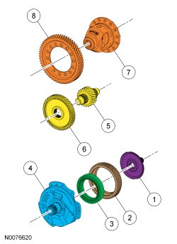 The center planetary ring gear is splined to the rear planetary carrier and transfers power from the center planetary gearset to the rear planetary gearset in 3rd gear, from the rear planetary gearset to the center planetary gearset in 4th gear and is held stationary by the low One-Way Clutch (OWC) and low/reverse clutch in 1st gear and reverse.
