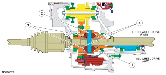 The torque converter housing has a lip-type seal that seals the torque converter hub. The manual lever shaft and halfshafts also use lip-type seals. AWD (All-Wheel Drive) vehicles do not use a RH halfshaft seal, the transaxle is sealed by the PTU (Power Transfer Unit) on the RH side.