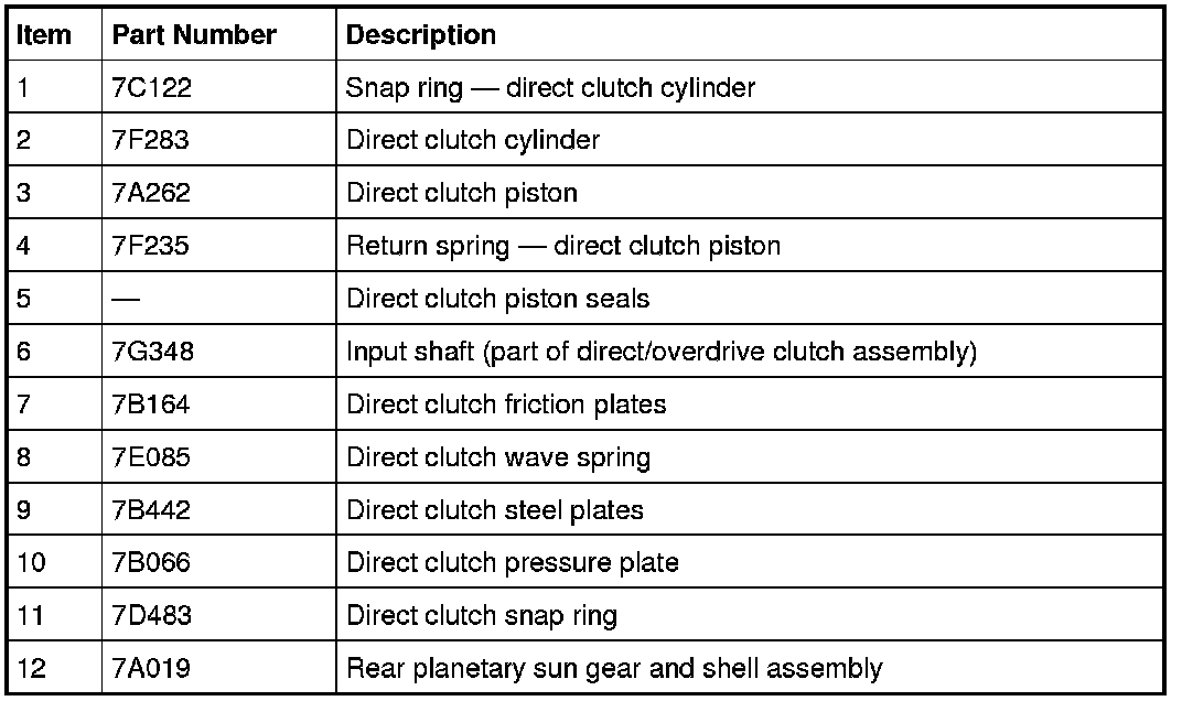 The direct clutch is a drive clutch that transfers power from the direct/overdrive hub and shaft assembly to the rear sun gear. The direct clutch is applied in 3rd and 5th gear and reverse.