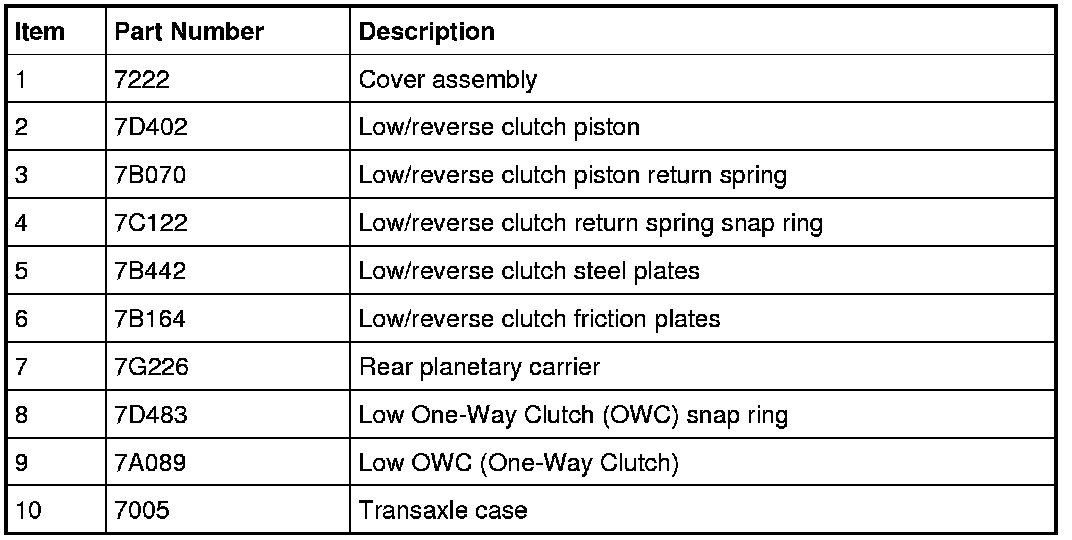 The low/reverse clutch is a brake clutch that holds the low OWC (One-Way Clutch) which is splined to the rear planetary carrier. The low/reverse clutch is applied in manual LOW, REVERSE and 1st gear up to 8 km/h (5 mph).