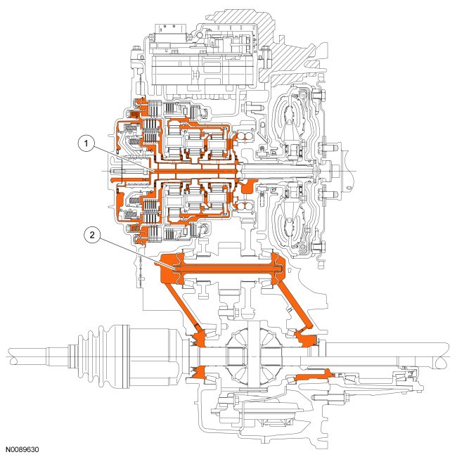 The transmission fluid enters 2 main lubrication circuits, the input shaft and final drive lubrication circuits, through the transaxle cover and flows through passages in the transaxle to lubricate the transaxle.