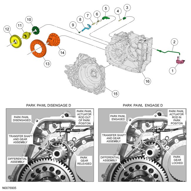 - The actuator rod pivots the park pawl into the lugs on the park gear, locking the gear stationary to the transaxle case.
