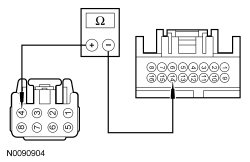 - Measure the resistance between LH rear window control switch C701-7, circuit CPW21 (BN), harness side and LH rear window motor C703-2, circuit CPW21 (BN), harness side.