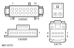 Connector Circuit Switch Position Expected Voltage C4179-2 CPS48 (BU) LH Between 4.2 and 8.1 volts C4179-2 CPS48 (BU) RH Between 3.0 and 5.9 volts C4179-2 CPS48 (BU) BOTH (LH and RH) Between 7 and 12.9 volts C4179-3 CPS49 (BN/GN) FOLD Between 1.2 and 1.5 volts C4179-3 CPS49 (BN/GN) TAILGATE Between 1.9 and 2.2 volts C4179-4 CPS50 (BU/BN) NORMAL Between 1.2 and 1.5 volts C4179-4 CPS50 (BU/BN) STOW Between 1.8 and 2.2 volts