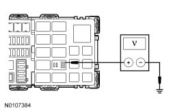 - Measure the voltage between the trailer battery charge relay pin 5, circuit SBB30 (BN/RD), BJB (Battery Junction Box) face side and ground.