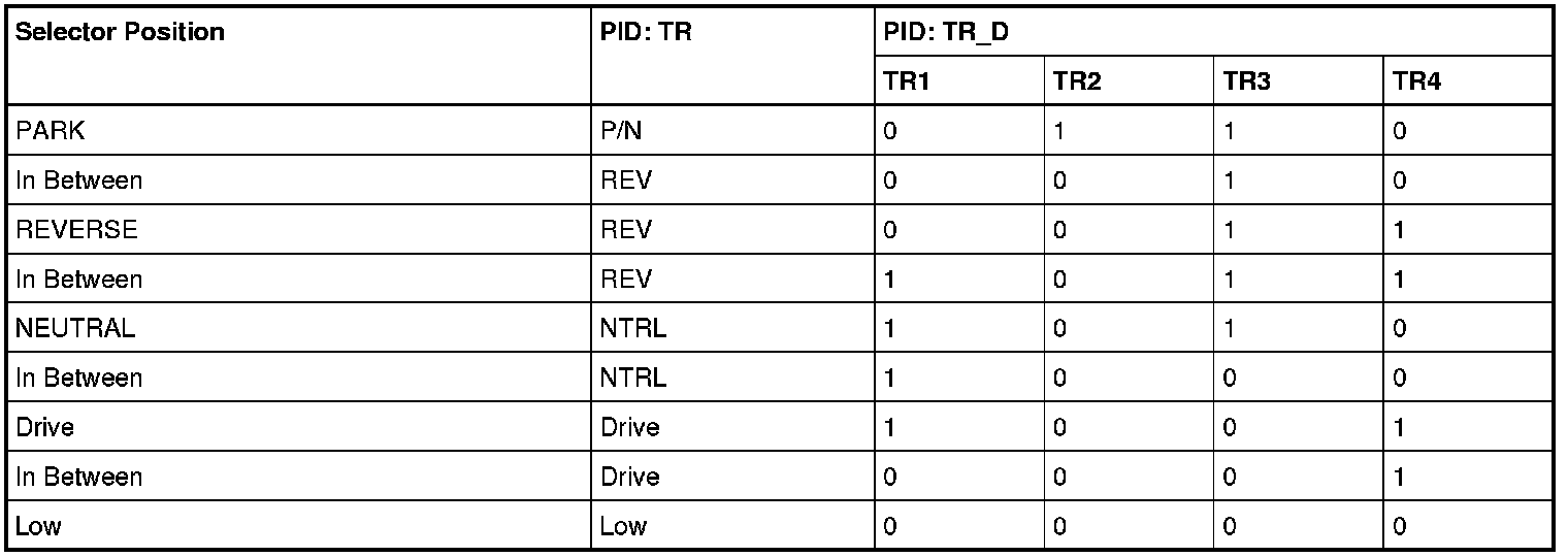 - TR (Transmission Range) PIDs: 1= Open digital TR (Transmission Range) switch, 0= Closed digital TR (Transmission Range) switch.