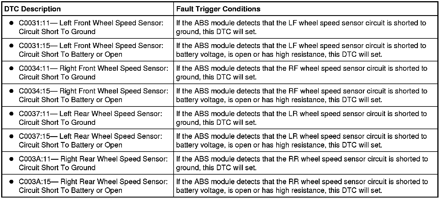 INSPECT the wheel speed sensors, wheel speed sensor wiring and wheel speed sensor tone rings. REPAIR or INSTALL new as necessary. If any other DTCs are retrieved, GO to the ABS Module DTC Chart. Antilock Brakes / Traction Control Systems