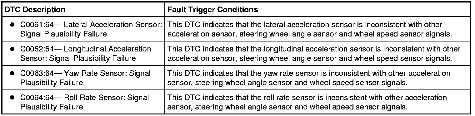 - For DTCs C0061:64: Monitor the lateral accelerometer (LAT_ACCEL) PID. Verify that the PID reads between -0.02g and 0.02g.