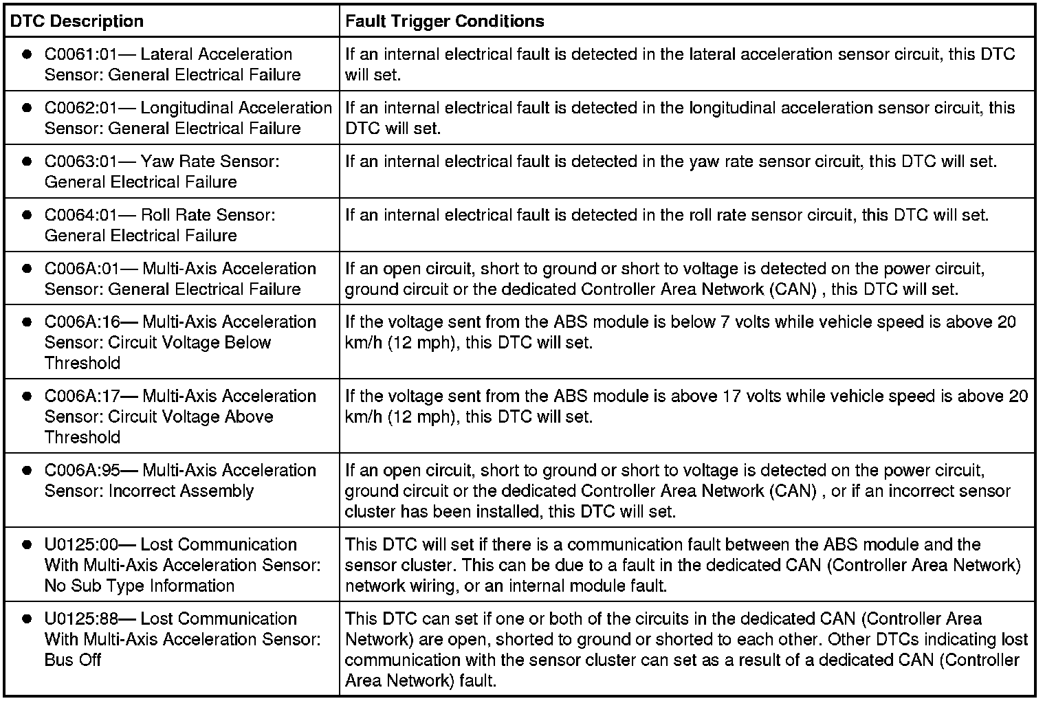 The voltage required for correct sensor cluster operation is between 7 and 17 volts. Both battery voltage and ground is supplied to the sensor cluster from the ABS module. The sensor cluster communicates with the ABS module over a dedicated Controller Area Network (CAN). A concern in any one of these circuits or an internal failure in the ABS module or sensor cluster will cause one or more of the DTCs listed below to set.