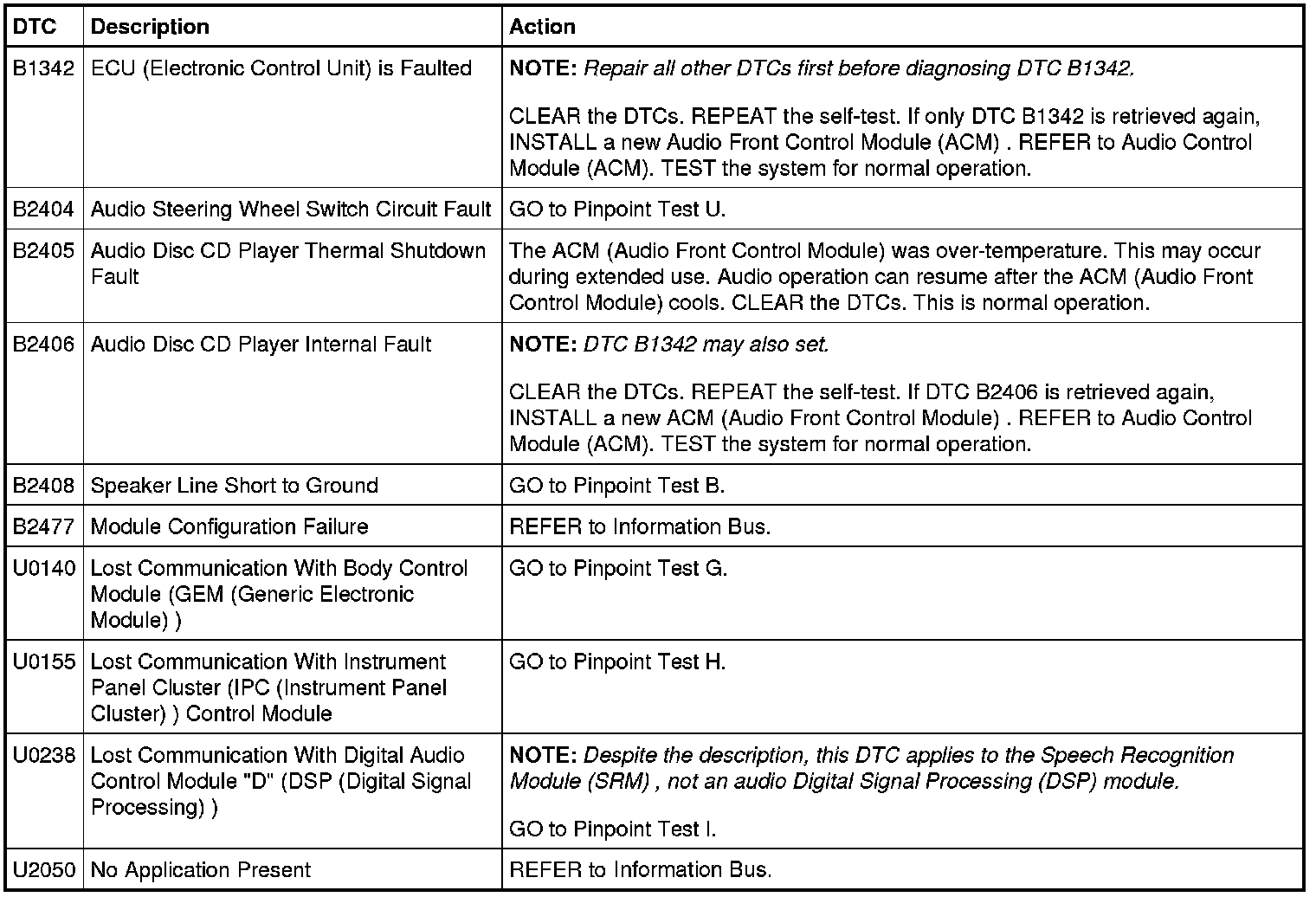 Audio Front Control Module (ACM) DTC Chart (Late Build)
