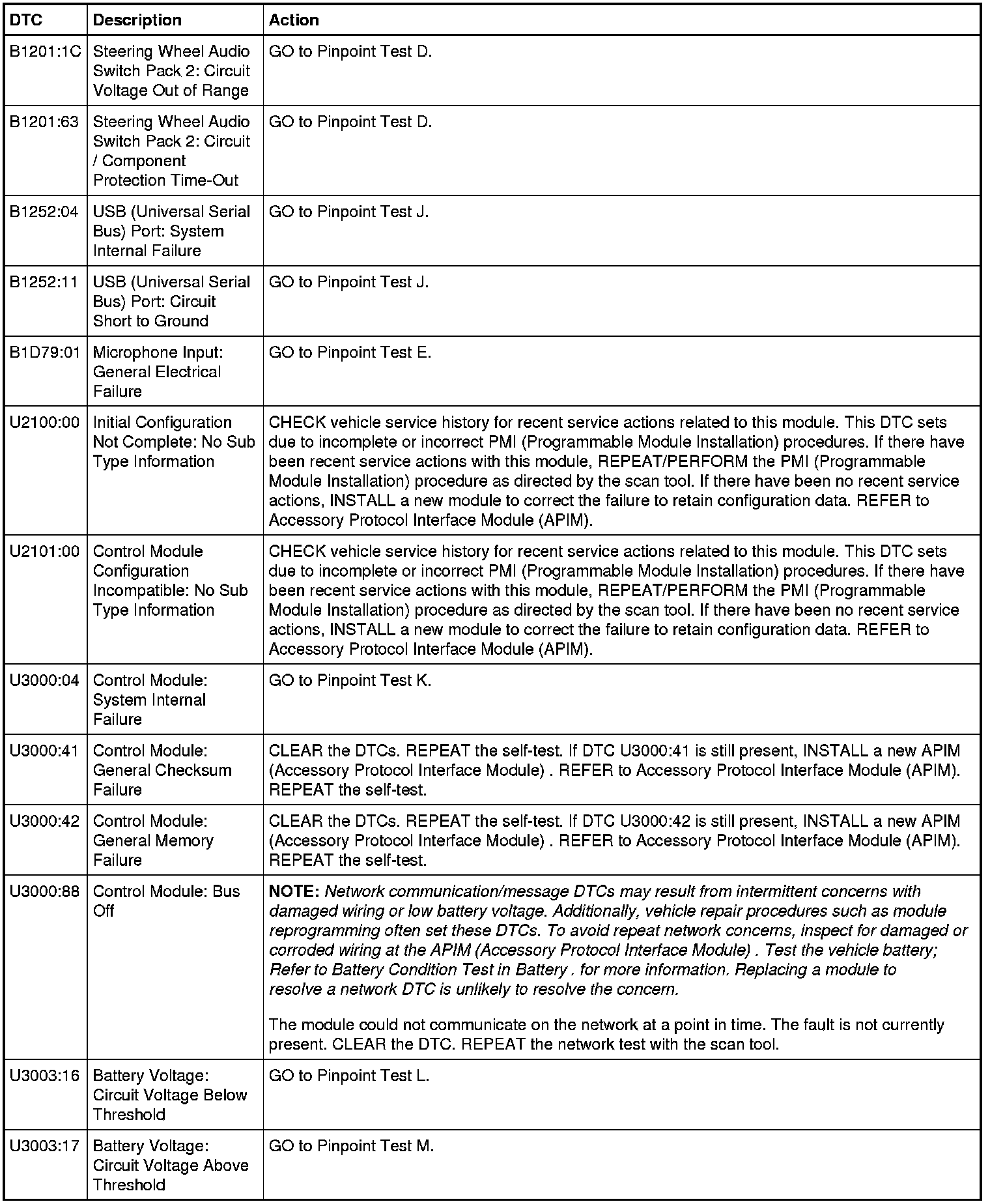 Accessory Protocol Interface Module (APIM) DTC Chart (Late Build)