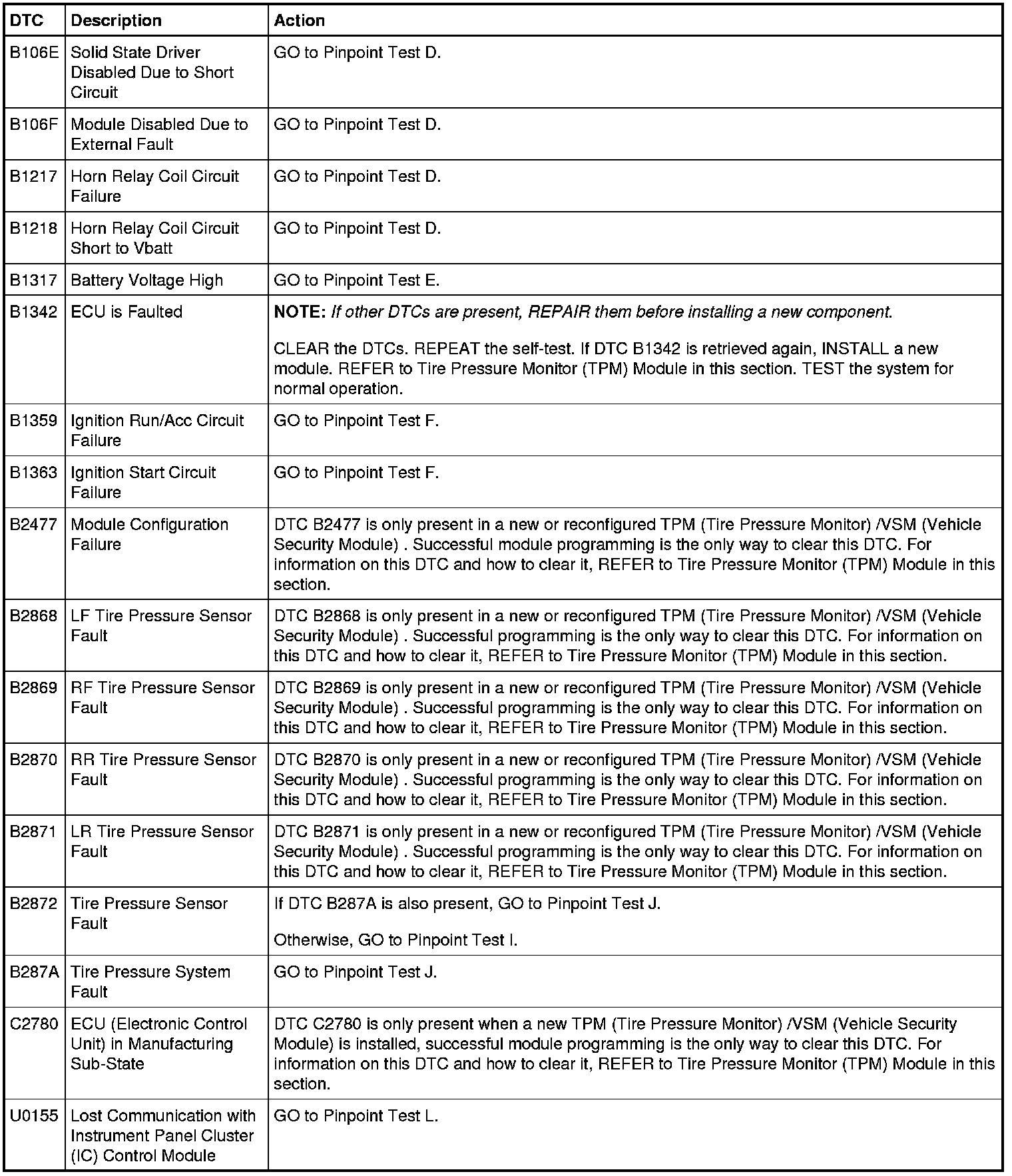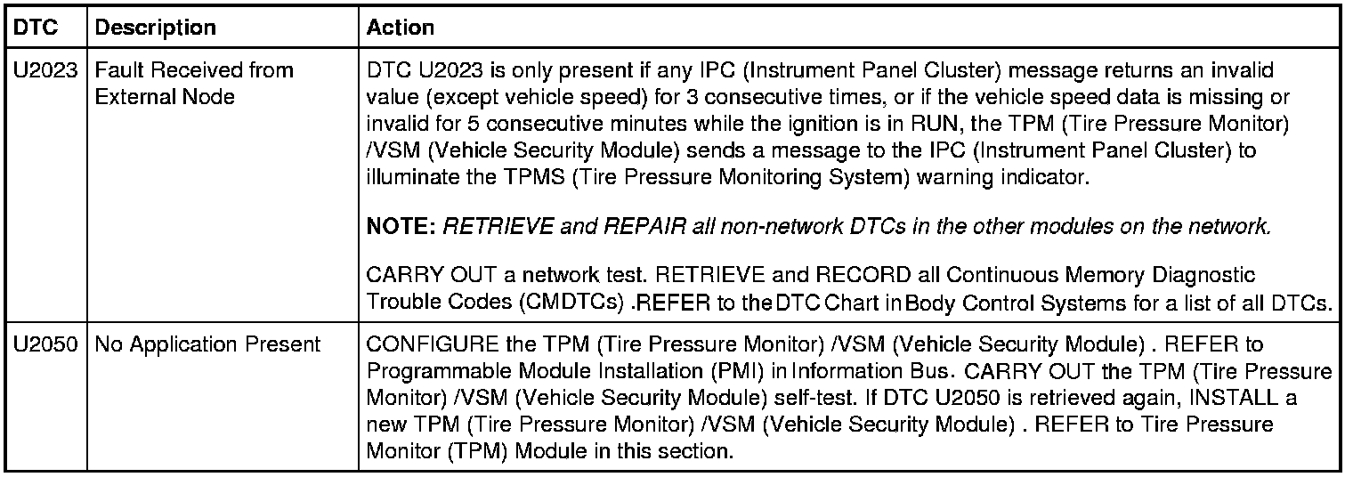 Tire Pressure Monitor (TPM) /Vehicle Security Module (VSM) DTC Chart