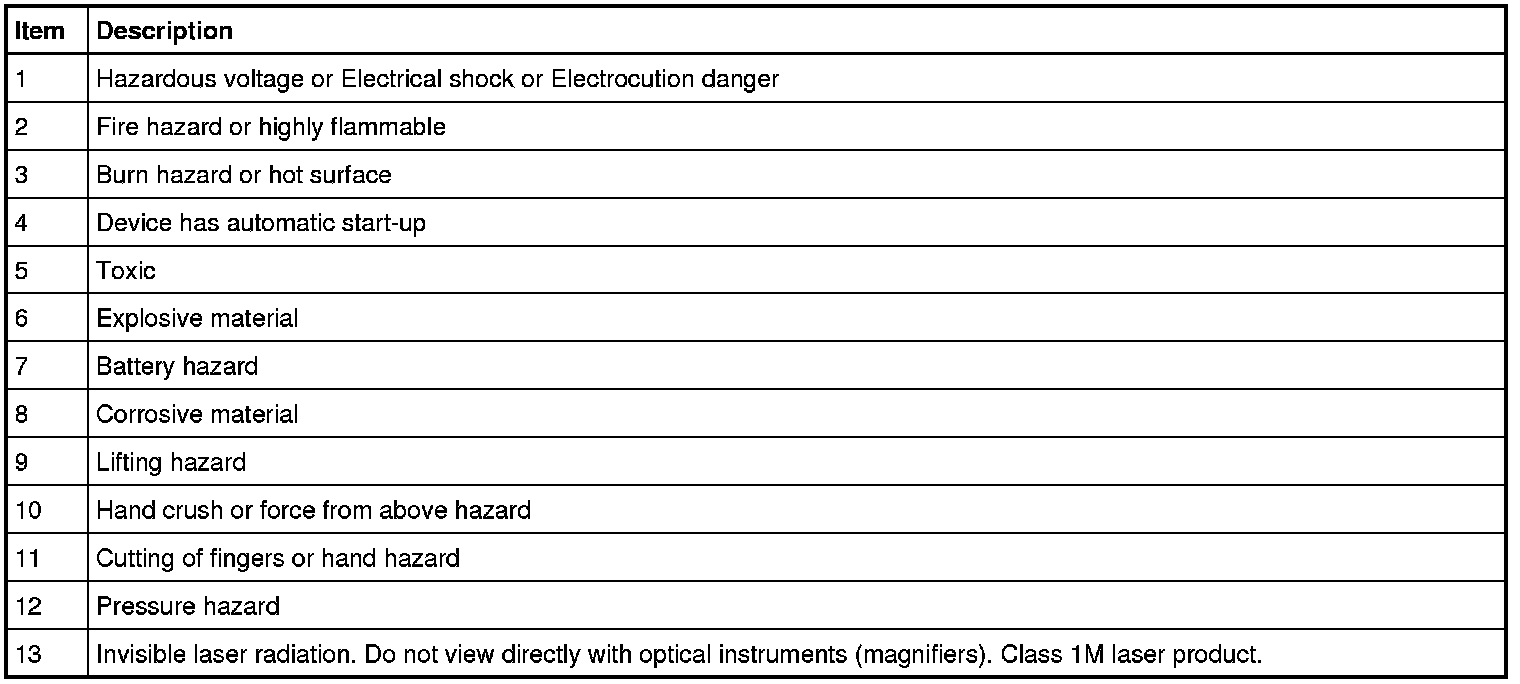 The protective equipment symbols indicate required safety equipment to avoid or reduce health and safety risks.
