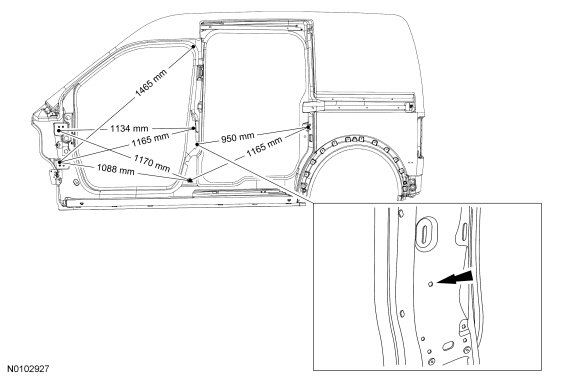 NOTE: Inset view of measurement of the sliding door opening (950 mm [37.401 in] dimension) is from interior of the B-pillar.