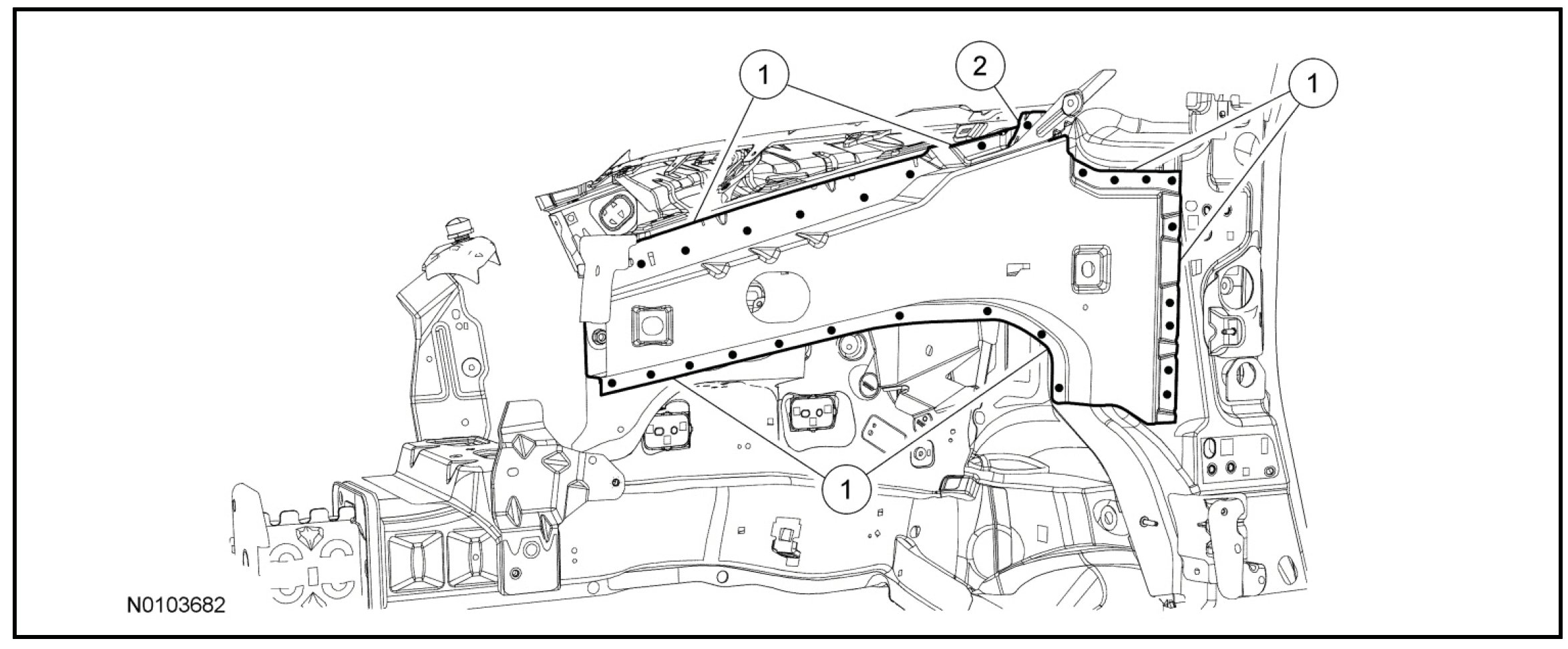 1. WARNING: Frame rail crush zones absorb crash energy during a collision and must be replaced if damaged. Straighten damaged frame rails to correct frame dimensions prior to frame member sectioning. Failure to follow these instructions may adversely affect frame rail performance and may result in serious personal injury to vehicle occupant(s).