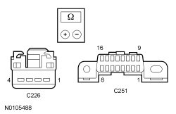 - Measure the resistance between SASM (Steering Angle Sensor Module) C226, harness side and Data Link Connector (DLC) C251, harness side, as indicated in the following chart: