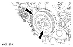 NOTICE: Do not loosen or remove the crankshaft pulley bolt without first installing the special tools as instructed. The crankshaft pulley and the crankshaft timing sprocket are not keyed to the crankshaft. The crankshaft, the crankshaft sprocket and the pulley are fitted together by friction, using diamond washers between the flange faces on each part. For that reason, the crankshaft sprocket is also unfastened if the pulley bolt is loosened. Before any repair requiring loosening or removal of the crankshaft pulley bolt, the crankshaft and camshafts must be locked in place by the special service tools, otherwise severe engine damage can occur.