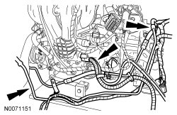 9. Position the 2 power steering tubes and the wiring harness as an assembly on the engine.
