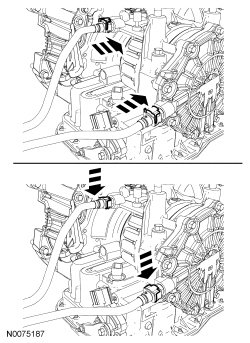 53. Install the transmission fluid cooler tubes on the transaxle and slide the latches to the locked position.