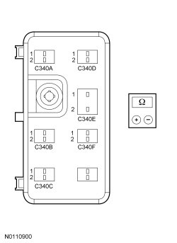 - Measure the resistance between passenger safety belt buckle switch C340D-1, circuit 8-JA55 (WH/BK), harness side and ground.
