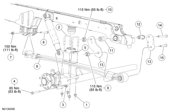 13. Tighten the shackle-to-spring nut to 115 Nm (85 lb-ft).