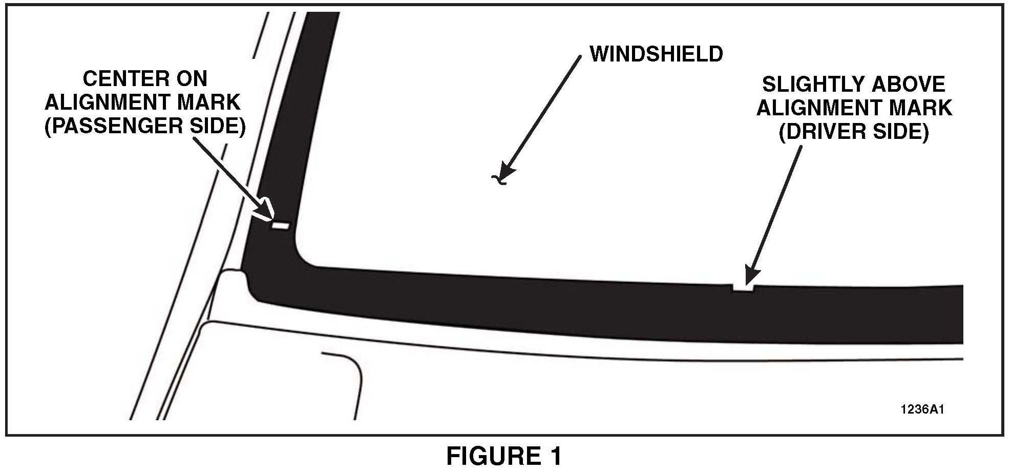 ^ Verify that the LH windshield wiper blade position is slightly above the driver side alignment mark located to the right of center on the windshield. See Figure 1.