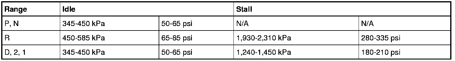 4. Start engine and check line pressures. Refer to the following Line Pressure Chart to determine if line pressure is within specifications.
