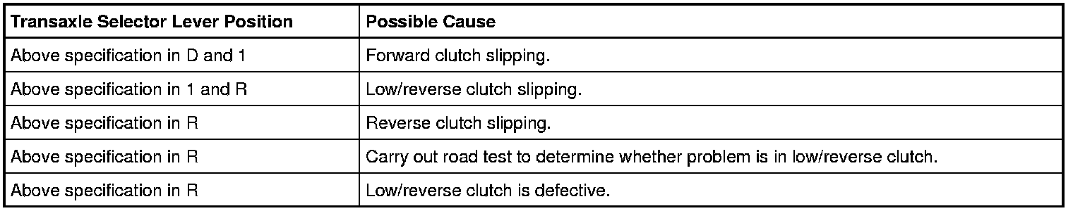 NOTICE: If the engine rpm recorded by the tachometer exceeds maximum specified rpm, release the accelerator pedal immediately, or further transaxle damage will occur. Clutch or band slippage is indicated.