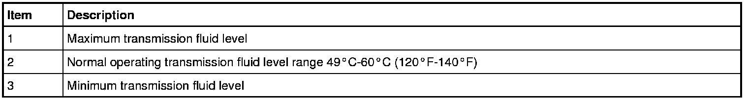 NOTE: The transmission fluid should be checked at normal operating temperature 49°C-60°C (120°F-140°F) on a level surface. Normal operating temperature can be reached after approximately 32 km (20 mi) of driving and can be checked using the scan tool.