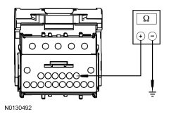 - Measure the resistance between the inoperative rear window defrost grid ground connector, harness side and ground.