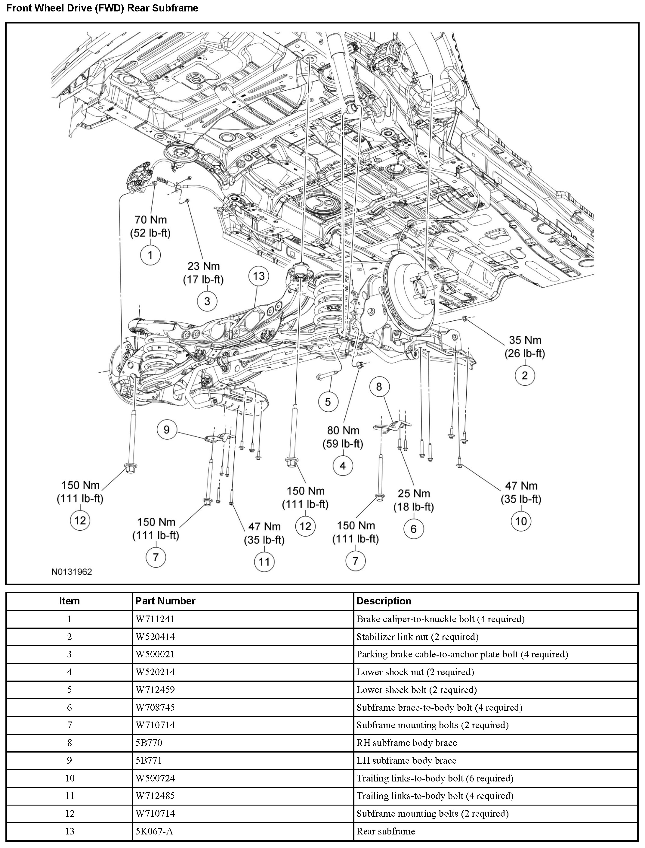 NOTICE: Suspension and subframe fasteners are critical parts because they affect performance of vital parts and systems and their failure may result in major service expense. A new part with the same part number must be installed if installation becomes necessary. Do not use a replacement part of lesser quality or substitute design. Torque values must be used as specified during reassembly to make sure of correct retention of these parts.