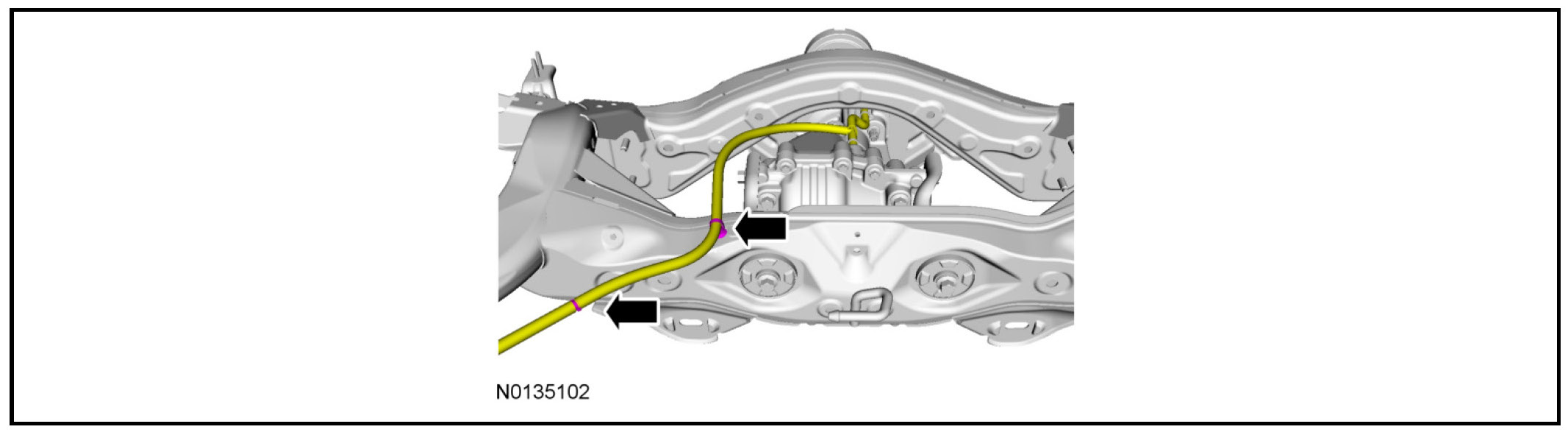 13. If equipped, disconnect the Rear Drive Unit (RDU) vent tube pushpin and hose adapter from the upper rear of the subframe.