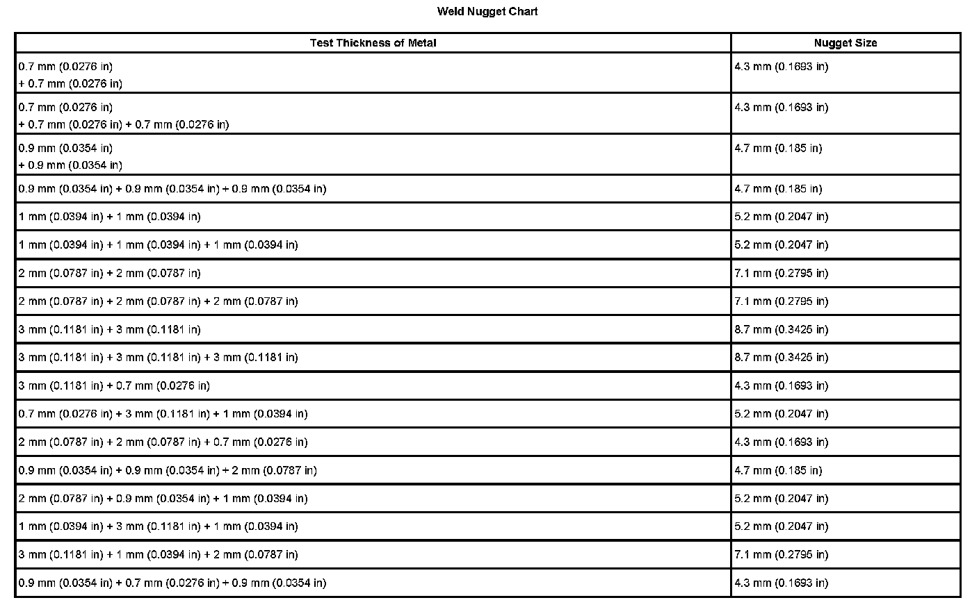 Weld Nugget Chart