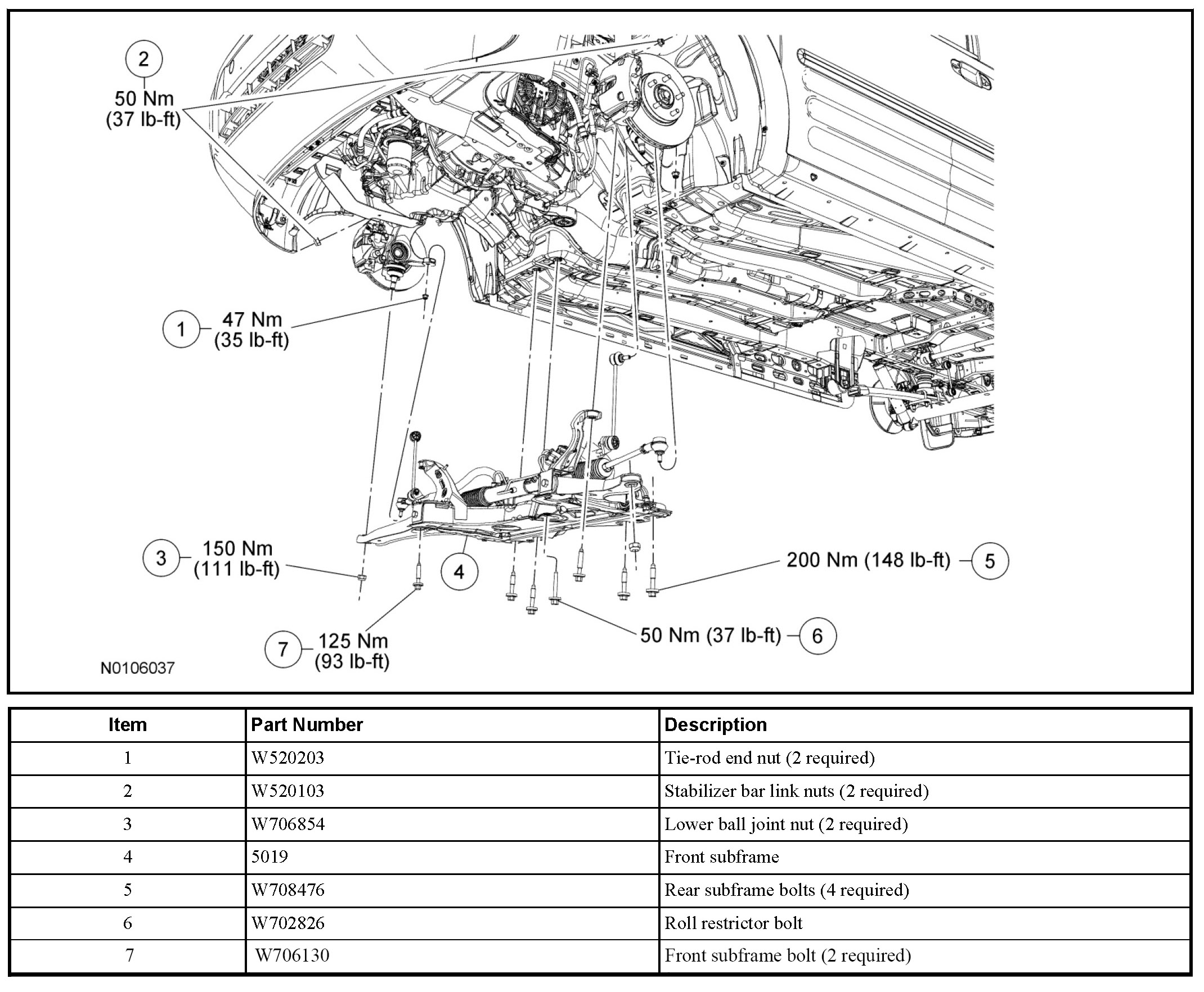 - Tighten the front subframe bolts to 125 Nm (93 lb-ft).
