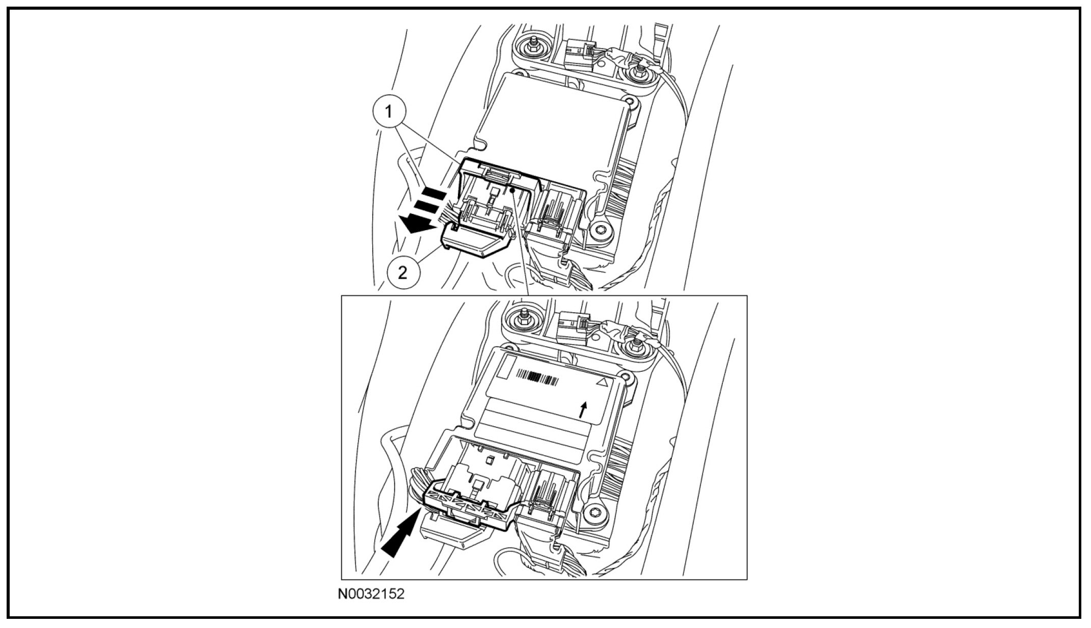1. WARNING: Always tighten the fasteners of the restraints control module (RCM) and impact sensor (if equipped) to the specified torque. Failure to do so may result in incorrect restraint system operation, which increases the risk of personal injury or death in a crash.