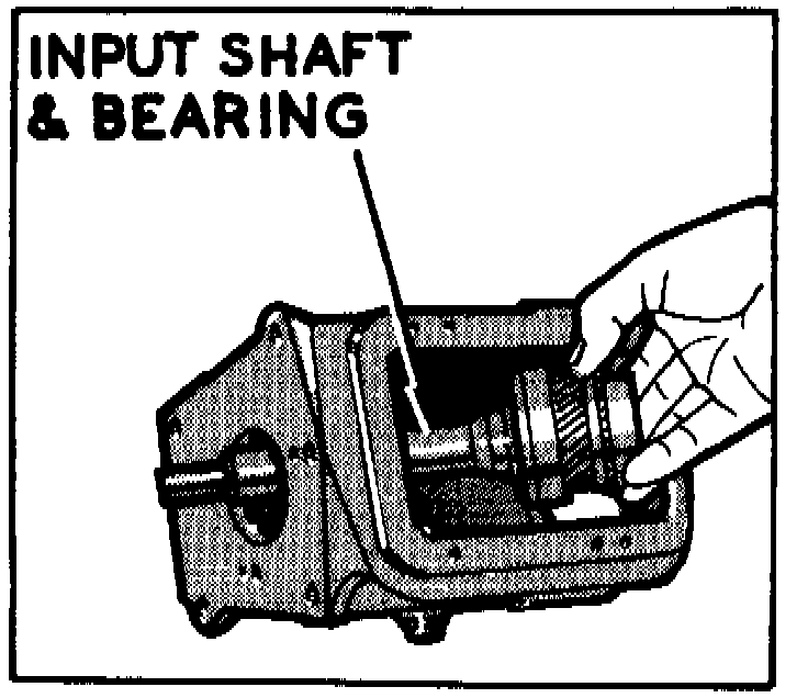 3. Install output shaft assembly into case through cover opening and place first gear thrust washer on roll pin and holding it securely. Install rear bearing, with snap ring groove facing rearward followed by the snap ring.