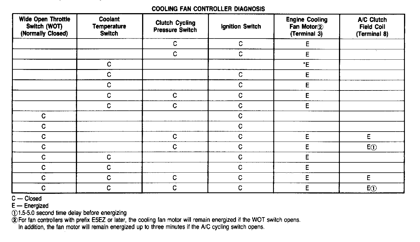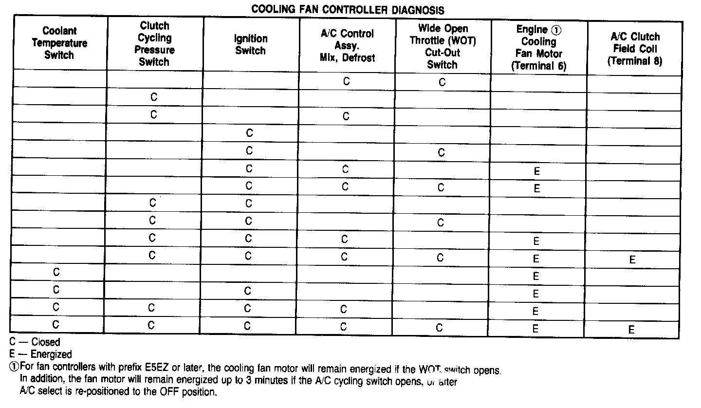 Each cooling fan controller has the part number stamped on the housing or on the mounting bracket to identify the controller. It is important that the correct controller be installed for proper operation. Locate the correct cooling fan controller diagnosis procedure and wiring diagram. Then, determine the position (open or closed) of each switch in the system (listed at top of diagnosis chart). Then, locate the appropriate row of the diagnosis chart to correspond with the switch positions. Follow the row to the right to determine if the letter F appears in that row. An E in the column at the right indicates that the component listed at the top of that column should be energized for the switch positions.