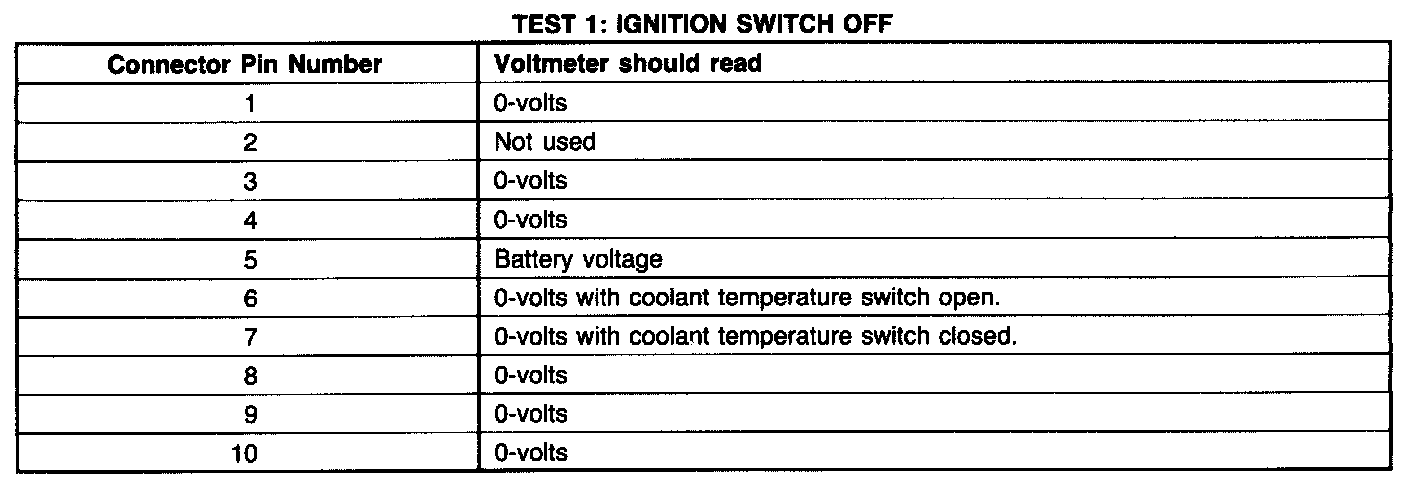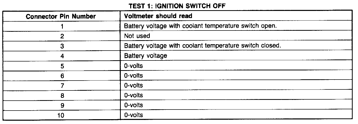 If it is suspected that the cooling fan controller is not operating properly, diagnosis of the controller can be performed by taking voltage/continuity readings at the controller connector with the connector plugged into the controller. The readings should be made during the following three tests: