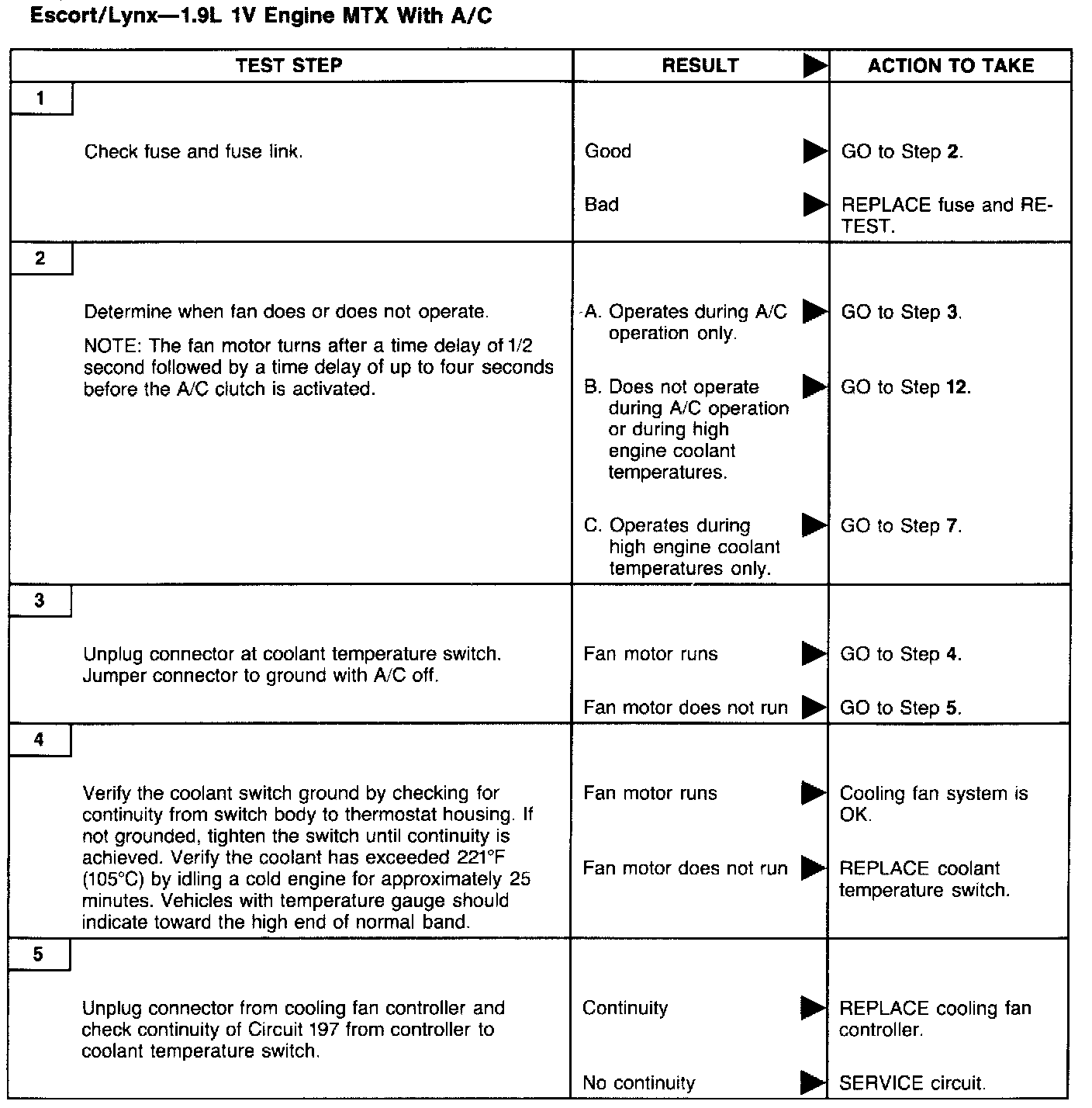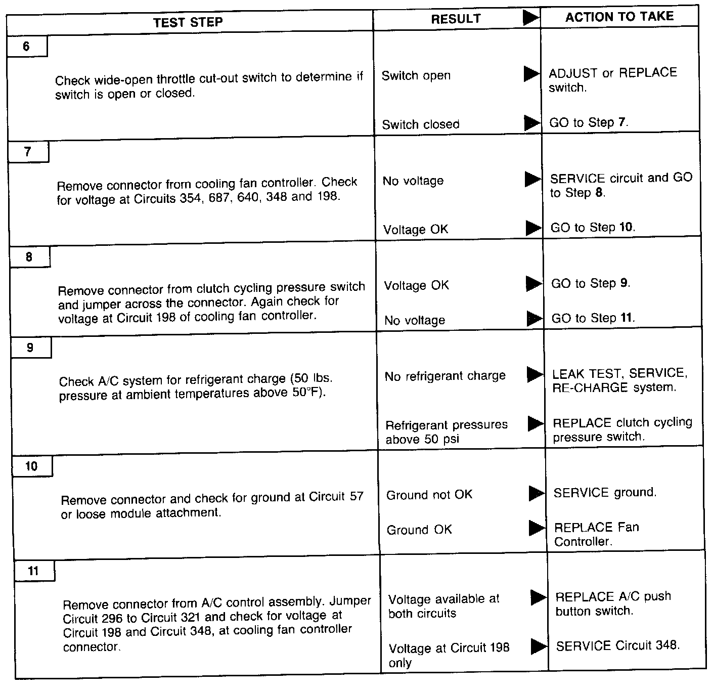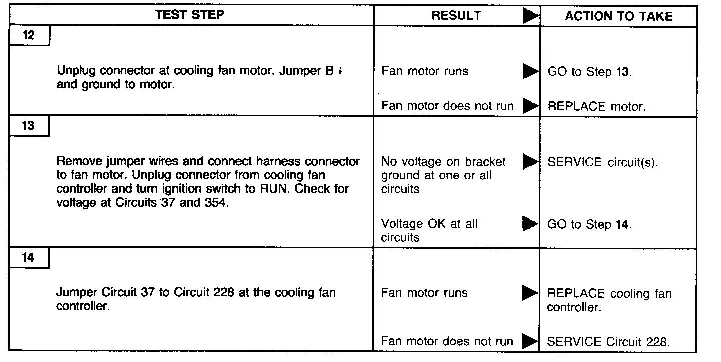 Once it has been determined that the cooling fan controller is not at fault, the following diagnostic charts can be used to check the rest of the cooling fan system to pinpoint the problem.