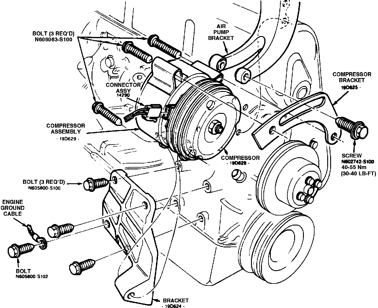 6. Remove compressor mounting bolt attaching bracket to compressor lower mounting lug.
