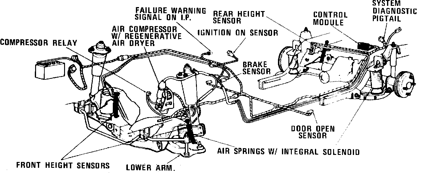 Fig. 1 Air suspension system. 1984---87 Continental & Mark VII (1987 Thunderbird turbo coupe system is similiar):