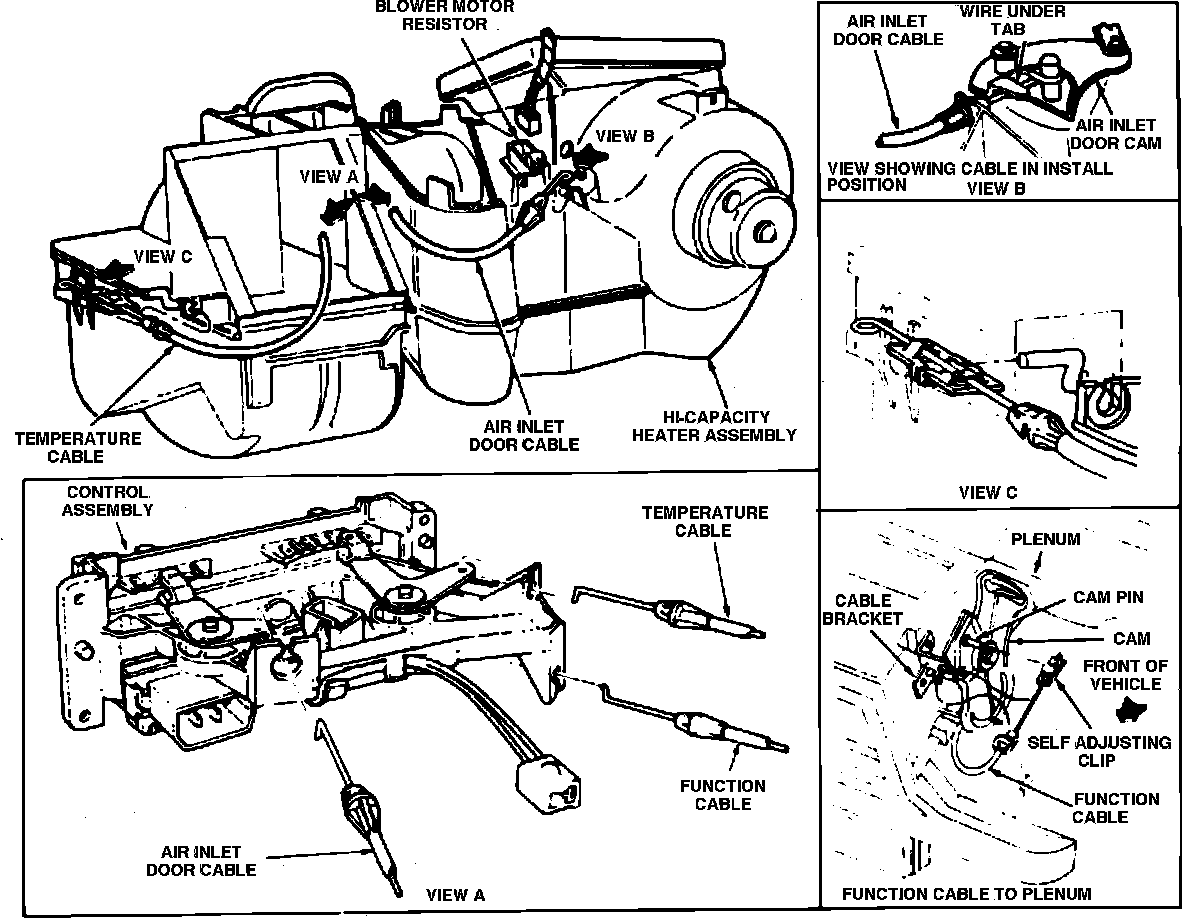 1. Move Max A/C Norm Selector lever to Max A/C position. Using control cable removal tool T83P-18532-AH, Fig. 14, disconnect air inlet cable housing end retainer from A/C case bracket, then disconnect cable from inlet door cam.