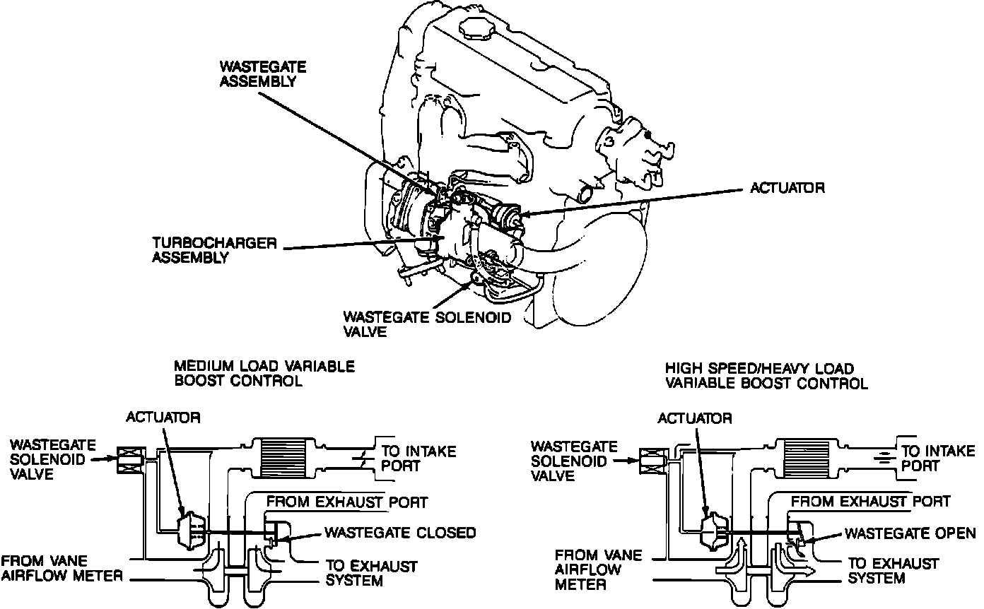 During high speed/heavy load conditions the amount of exhaust gas increases and the intake air pressure also increases. When intake air pressure at the compressor housing reaches 60 kPa (8.7 psi), the pressure will act on the actuator diaphragm and will overcome the force of the spring within the actuator, and the wastegate will open the bypass passage. As a result, the flow of exhaust gas supplied to the turbine wheel housing will drop, and the rpm of the turbine wheel will decrease. It is in this way that the boost pressure is regulated to the maximum pressure.