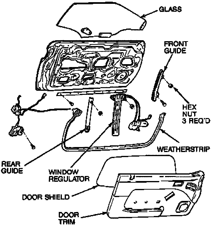 8. Remove the six window regulator-to-door retaining nuts. Disconnect the electric motor wire connector and remove the regulator assembly through the service hole.