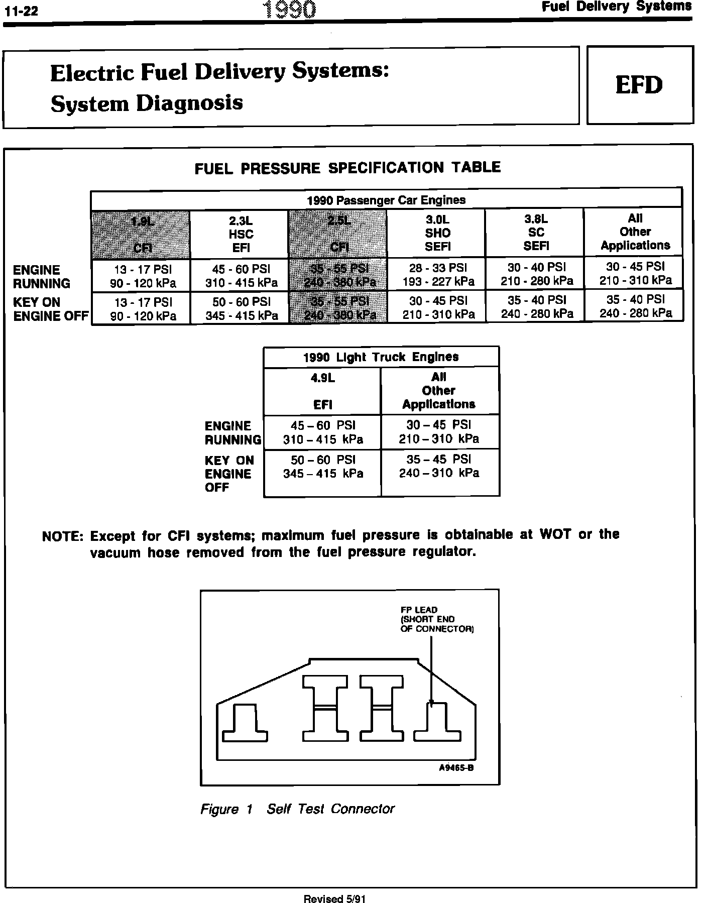 ^ ENGINE/EMISSIONS DIAGNOSIS MANUAL - 1990 - PAGES 11-22 AND 17-204 - FUEL PRESSURE SPECIFICATIONS REVISED
