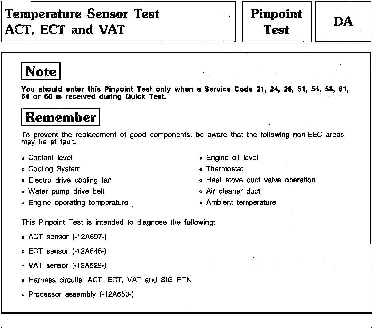 Pinpoint Test DA - Temperature Sensor Test ACT, ECT and VAT: