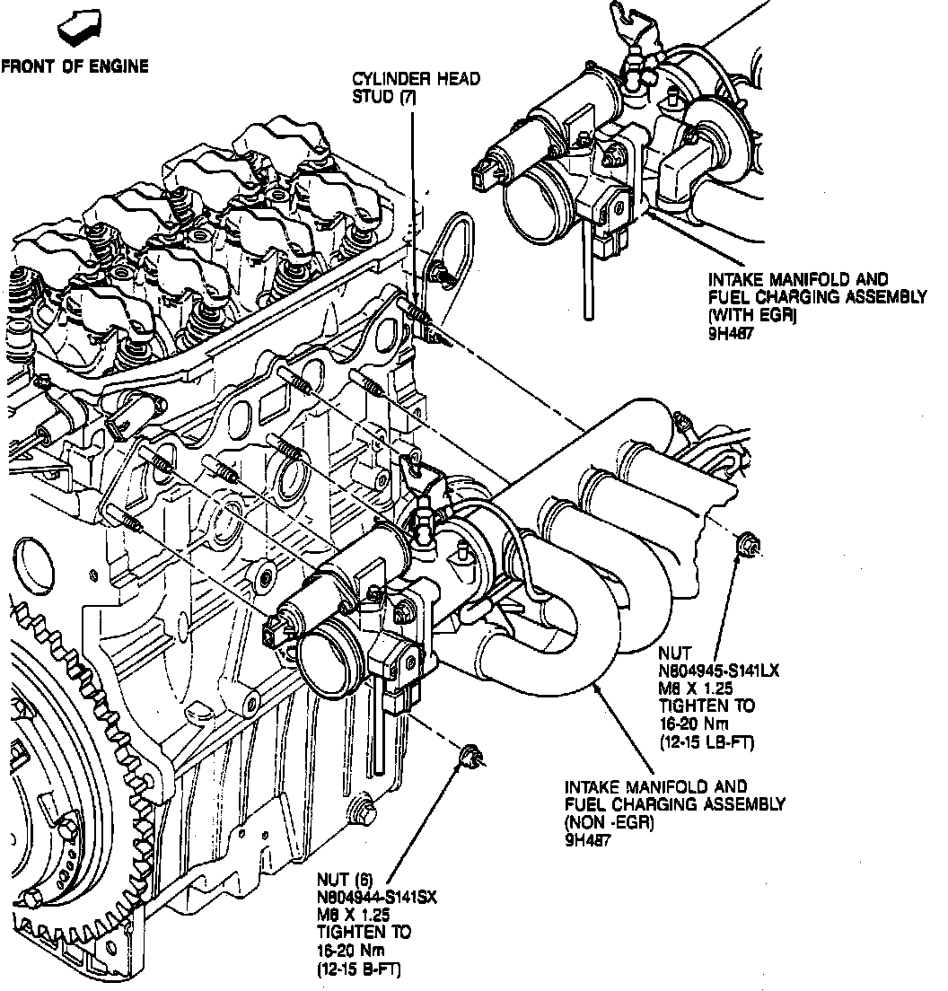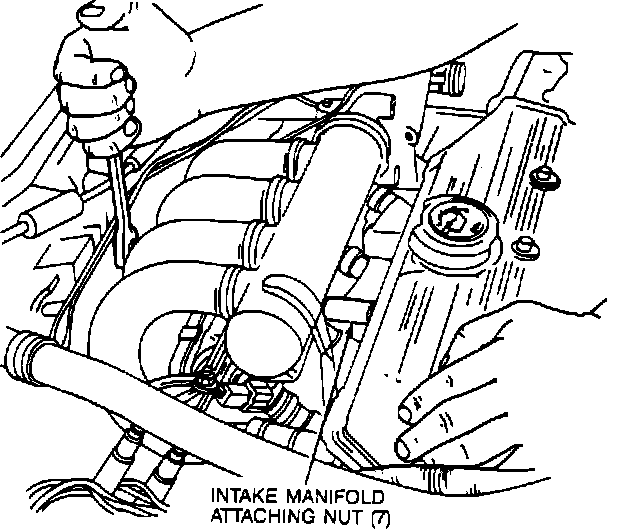 12. Remove the seven attaching nuts from the intake manifold studs.