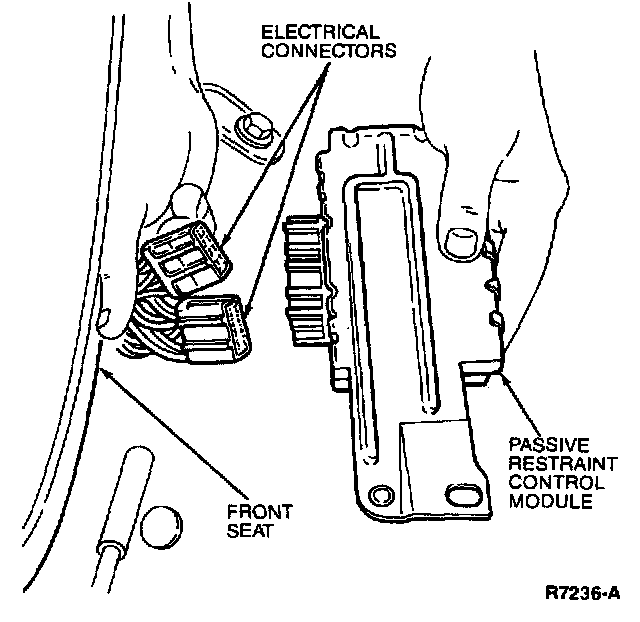 3. Disconnect the two electrical connectors from the passive restraint control module and remove the module.