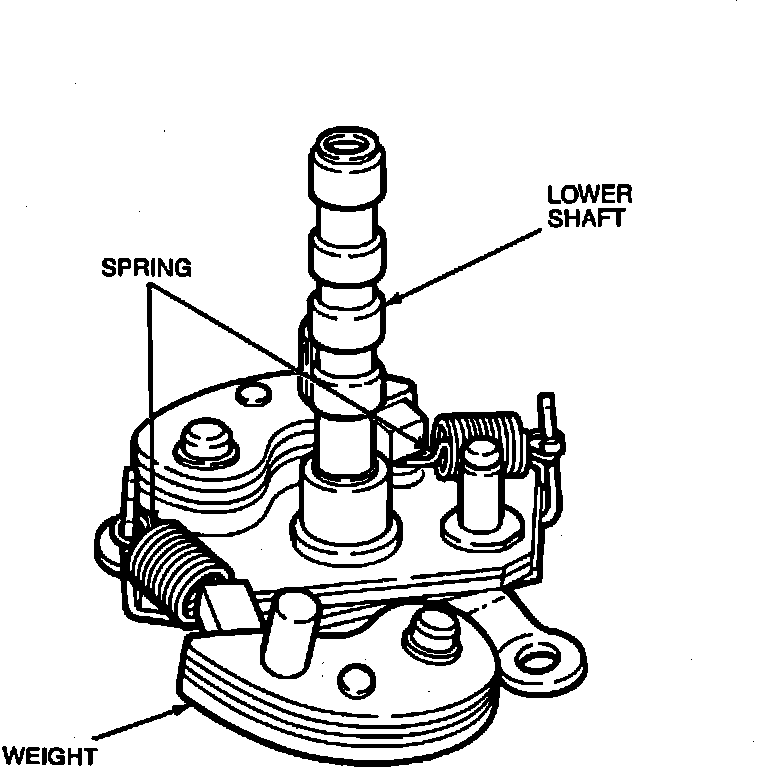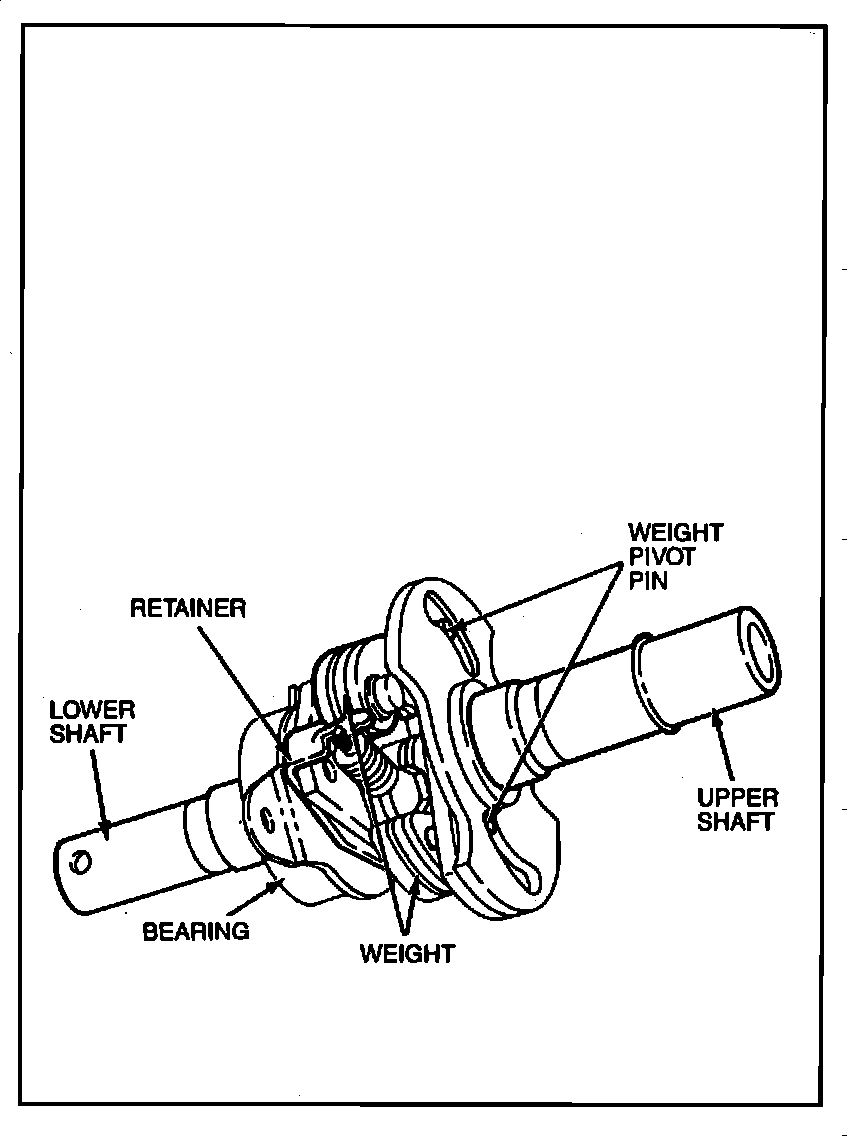 2. Install bearing, retainer, weights, springs and E-clips to the lower shaft. Ensure weight pivot pins engage the advance mechanism.